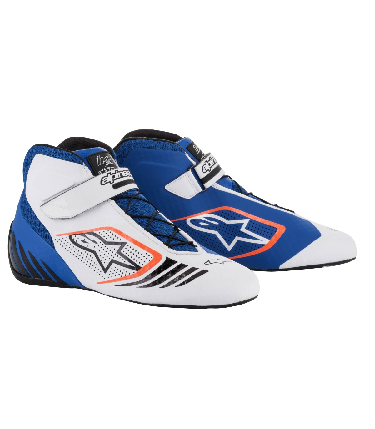 Botas Alpinestars  modelo Tech-1 KX azul y blanco con detalles naranja fluor y negro.  Una construcción de soldadura térmica sin costuras de film ultra fino de poliuretano y malla 3D da máxima ligereza y comodidad efecto "calcetín", no hay puntos de presión.