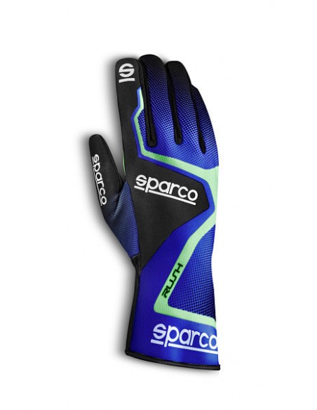 Guantes Sparco Rush, color azul con detalles verde fluo.